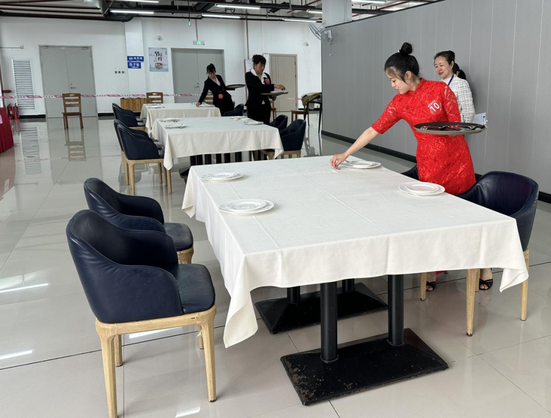 本次餐廳服務(wù)員技能競賽分中餐服務(wù)與西餐服務(wù)兩個項(xiàng)目,圍繞儀容儀表、擺臺、服務(wù)意識、餐巾折花和拉椅讓座等內(nèi)容進(jìn)行評分,主要考查選手操作的熟練性、規(guī)范性、實(shí)用性與觀賞性。為確保此次餐廳服務(wù)員大賽順利舉辦,興南學(xué)校認(rèn)真做好賽前溝通、現(xiàn)場布置和設(shè)備采購等籌備工作,確保比賽順利開展。